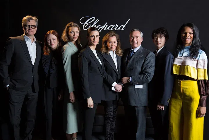 Colin Firth、Julianne Moore、Arizona Muse、Livia Firth、王源、Noella Coursaris Musunka与萧邦联合总裁Caroline Scheufele Karl-Friedrich Scheufele合影。