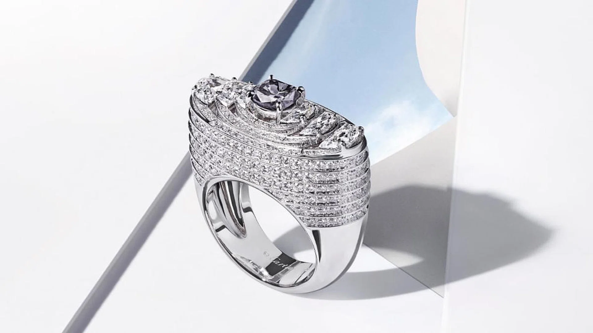 除了彩色宝石,拥有天然色彩的钻石也逐渐开始得到普及。从蓝色、棕色、粉红色到绿色和黄色,它们拥有许多不同的色调,且每一种色彩都是独一无二的,因为此特别弥足珍贵。卡地亚(Cartier)全新高级珠宝系列中的一款Ondule白金戒指,镶有重达0.92克拉的罕见灰紫钻石,周围环绕着的半月形切割钻石散发闪耀光芒,完美衬托主石的瑰丽美态。