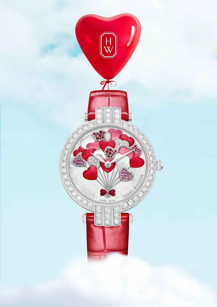 “爱你令我轻飘飘。”热恋中的情侣身体仿佛失去重量,轻得像气泡飞上天。今年情人节,海瑞温斯顿(Harry Winston)推出全新Premier系列情人节主题Flying Hearts 36毫米自动腕表,限量发售14枚。一束以珍贵宝石和蛋面珍珠母贝雕琢的心形的气球描绘出爱的不同方式,在晶莹空灵的母贝天空中呈现,搭配着红色珍珠亮面鳄鱼皮表带,白金针形表扣,共镶嵌17颗圆形明亮式切工钻石,完美环绕贴合手腕。