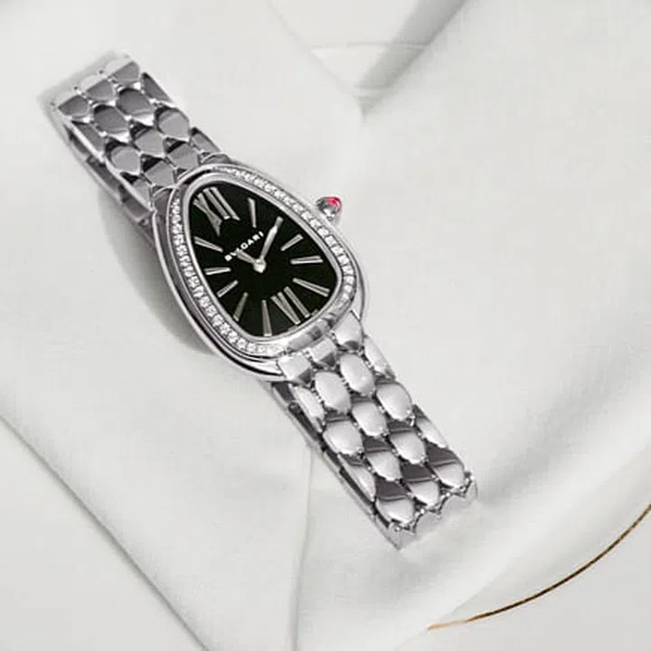 宝格丽(Bvlgari)Serpenti Seduttori腕表采用标志性的水滴形表头以及性感而柔软的手炼,手炼以蛇鳞为灵感创作出六角形图案,将迷人的美学与高级珠宝的魅力融为一体。