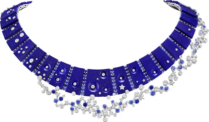 Ciel de minuit项链再现了耀目璀璨的银河,令思绪与想象飘向遥远星河。青金石是夜的帷幔,于世家工坊经工匠巧手悉心雕琢,完美配合作品的结构,而黄铁矿金色的微光则仿佛点点星尘错落银河之间。青金石经精心雕琢与打磨后饰以璀璨钻石,与萦绕项链的蓝宝石和钻石遥相回应,仿佛夜幕与星河的对话。项链造型优雅,铰接构件精心隐于宝石图案下,再现蓝宝石微妙的色彩变化。装饰宝石与贵宝石奏响协奏曲,配合不同材质交织而成的立体之美,令人遨游于浩瀚星空的深邃之中。