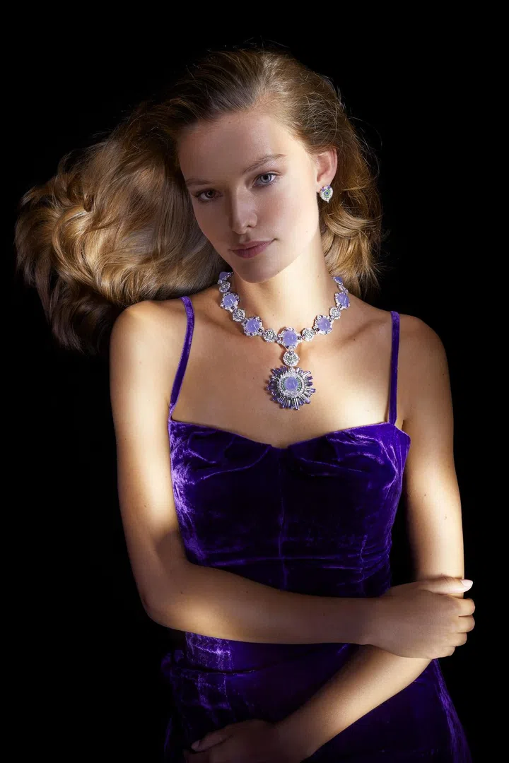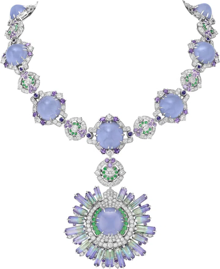 造父变星相比太阳更加闪耀,其亮度呈周期性变化。这些巨大的星体启发梵克雅宝创造出Cepheide珠宝套装,以渐变的色彩演绎星系的夺目光芒。沙弗莱石榴石、钻石和紫色蓝宝石图案错落有致,衬托着11颗共重159.72克拉的蛋面切割玉髓。晶莹剔透的玉髓呈现着柔和的淡蓝色调,期间漾其浅灰色的光芒。可拆式吊坠上则镶嵌着21颗长方型切割的双色坦桑石,由蓝至紫渐变的色彩,与淡蓝灰色的玉髓呼应。世