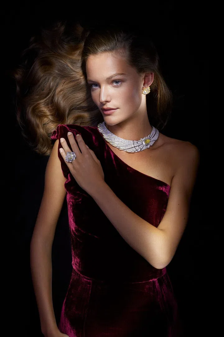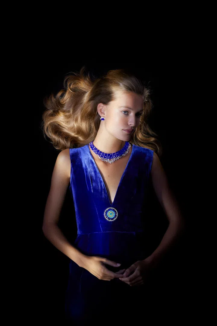 于颈间绽放。蛋面切割蓝宝石重逾69克拉,静静伏于 Sentier d'étoiles手镯中央,星光璀璨盛放。目之所及,皆是作品的光芒和色彩与宝石的光影变幻;心之所向,随九天之外的浩瀚无垠飘逸驰骋。