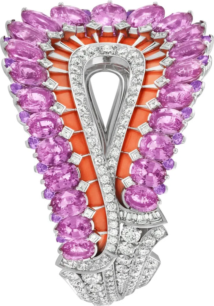 世家仰望苍穹,在地平线的尽头捕捉温暖的日影奇景,成就这枚夺目的手镯。41颗共重57.98克拉的椭圆形粉红色蓝宝石勾勒出璀璨的日影,再现象征永恒的图案。这阙迷人的材质协奏曲以带蓝调的紫色蓝宝石和鲜橙色的珊瑚衬托柔和的粉红蓝宝石;珊瑚于镶嵌后再经悉心雕琢,以映衬手镯的唯美的弧度,再以圆型、方型和长方型切割钻石加以点缀,为珊瑚铺上一层灿烂光晕。密镶、爪镶、粒镶、角镶及彩镶等高级珠宝工艺技术交替运用,使得宝石在腕上绽放微妙的渐变色彩,仿佛日出与余晖同耀此刻。