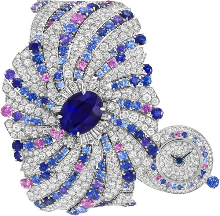 色彩与线条升腾的朵朵星云,秘密的表盘沉于这奇幻的宇宙奇观之中,这枚高级珠宝腕表生动再现光阴的轨迹,让转瞬即逝的时光永恒凝刻于钻石和蓝色、粉红色及紫色蓝宝石交织的诗意漩涡之中,令人心驰目眩。腕表的手镯部分采用镂空的设计,最大程度地绽放彩色宝石的玲珑与剔透,仿佛夜空中最亮的星光。中央镶嵌一颗重8.05克拉的椭圆型蓝宝石,其深邃之蓝被周围环绕的长方型切割钻石点亮。每一颗钻