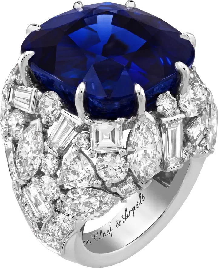 这枚戒指将壮美的银河凝于指间,将太阳系最遥远的第八颗行星海王星的神秘面貌,化作一泓深邃的蓝,映照在一颗40.52克拉的马达加斯加蓝宝石之上。不同形状的钻石环绕镶座和环侧,精湛的镶嵌工艺将苍穹中环绕海王星的冰晶生动重现,为作品平添优美的立体之感,璀璨闪耀萦绕中央主石,使得其形更具迷人之态。