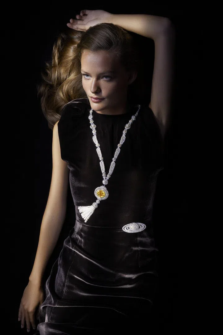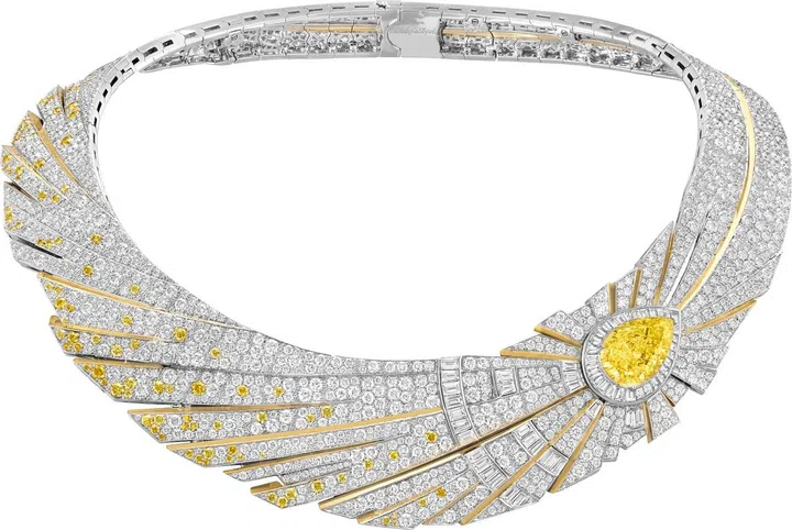 作为系列中的瞩目作品之一,此项链从每隔75年重访地球一次的哈雷彗星中撷取灵感。一颗重达11.29克拉的艳彩黄钻,象征彗星的主体,瞩目的梨型切割流露出古典与优雅至美,加之温柔和煦的光芒,令主石更显夺目。主石微微偏向一侧,迸发出道道如钻石般璀璨的光芒,犹如彗星滑过夜空那一缕动人的轨迹,大小不一的黄钻与白钻错落有致,犹如彗星的尾巴,黄K金光线迸发而出,勾勒出项链美妙的构图。世家传承可转换式珠宝的经典设计,将项链的黄钻主石打造成可拆卸式图案,可搭配戒托进行佩戴。此外,另有一枚镶嵌一颗DFL级钻石的图案,可为项链或戒指增添璀璨之光。