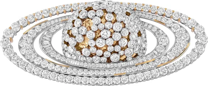 Saturne胸针是该系列其中一件具象的作品,以金质和钻石再现土星这一太阳系第二大行星的瑰丽,生动地呈现出这颗赭色星球及其巨大的环形带。密镶钻石如土星表面升腾起的雾气,经锤打的黄K金星球半掩于其下,镶嵌钻石的土星环默默环绕着行星。绉纹金工是梵克雅宝1960至70年代作品格外常见的工艺,将材质之间的对比,即凹凸与平滑、贵金属与宝石的对比,衬托得细腻动人。以黄K金勾勒的细致线条围绕土星环,使得胸针整体更加立体,更具浩瀚澎湃之感。