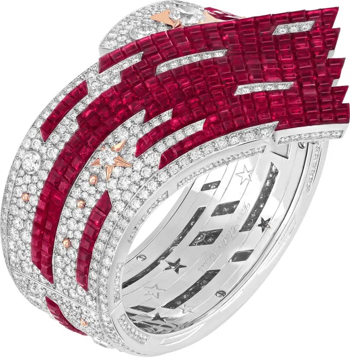 Ison手镯令人联想到同名彗星,这颗掠日彗星在2013年在赴日之旅中灰飞烟灭。那次罕见的天文现象启发世家创造出这件夺目璀璨的手镯,凝萃钻石和Mystery Set隐密式镶嵌红宝石。赤焰般的彗星碎片萦绕手腕,错落有致的圆钻恍如彗星蒸发后的点点冰凌;一颗颗钻石在玫瑰金星星中迸发光芒,为手镯更添别样的光彩。