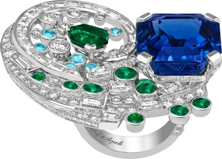 蓝宝石因不同切割方式更具瑰丽深邃,与星点黄铁矿点缀其上的青金石以及欲翠的祖母绿和谐交辉。玉髓及坦桑石在Céphéide珠宝之上合