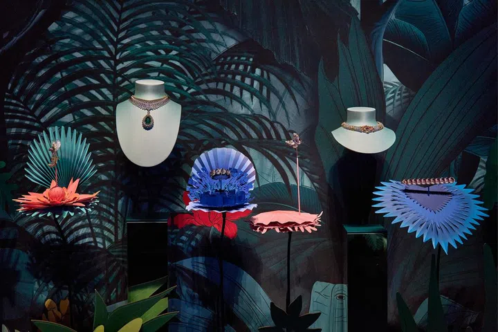 Palmeraie merveilleuse 系列,则将目光转向热带植物的繁茂姿态。同名项链造型灵感来自编织成冠的棕榈叶,整条项链由一节节铰接结构组成,仿佛顺着佩戴者颈部的线条自然生长。祖母绿主石重达47.93克拉,其浓郁色泽与立体切割令人联想到热带雨林中阳光照射下的绿叶微光。吊
