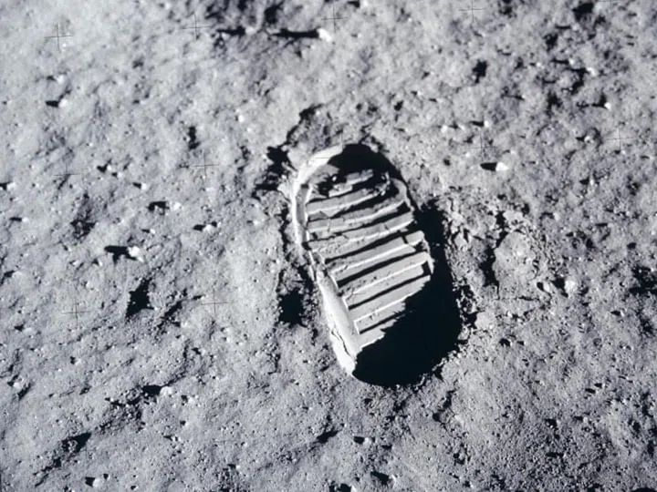 地表上的鞋印不像沙土或尘埃,非常显著。我为之吸引,心想:“一定要好好拍下这一幕的照片,但必须是之前与之后的对照。”所以,我选了一个很平滑的地点,踩下脚步,结果成为人类登上月球的极具代表性的照片。它看起来有点孤独,于是我决定再拍一张,不比第一张那么出名,但我又踩了一步,所以你会看到鞋子与鞋印。这些脚印当然很小,但每跨出一步,都是在往前走动,都会有尘土飞扬,改变了表层的颜色。我们报道了当时在外面做了什么,一两年后,一艘月球勘测轨道飞行器从很高的高度拍了一些照片,可以看到月球上留下的白色下降段以及试验留下的一些遗迹。我们身后有一个陨石坑,仔细看可以看到一条深色的步径,当时我回到太空船了,而Neil回去拍摄这个陨石坑。你可以看到,他走另一条不稍微不同的路回来,在太空中两条路都亮起来。大约有10英尺的步径,以较深的颜色显示。