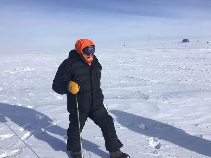 但我终于来到南极了,你相信吗,这一身冬装让人寸步难移,比穿着太空服更艰难。我们搭乘一架老旧飞机,没有气压,而南极是海拔9000尺。抵达后,飞机没有停得很近,我们必须穿着这身沉甸甸的衣服走过雪地,而我平时在机场的闸门间走动,都会走得喘不过气来!