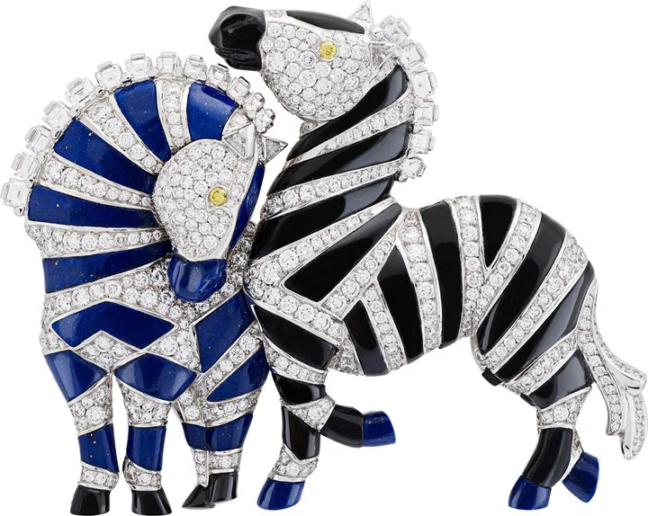 得益于融合的宝石材质,Zèbres 胸针通过美钻、青金石和缟玛瑙 相间萦绕于斑马的身躯,勾勒出 鲜明斑纹,令人难忘。一只斑马 的马蹄微微提起,与低首同伴的 相互呼应,情感流转而含蓄。斑 马的口鼻由青金石及缟玛瑙点缀 而成,与精心打造的细节互相辉 映。圆形、正方形及三角形切割 美钻凸显爱侣身姿,几何线条交 织出典雅和谐的气息。