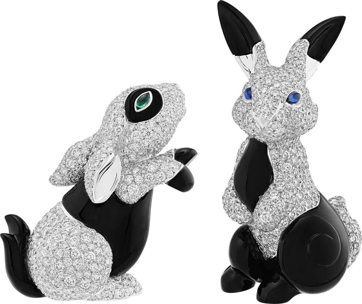 白兔屈腿而坐,仿佛正与凝神远望的伴侣诉说秘密。早于1910年 起,白兔已为世家动物系列的一员。今天,这种为人熟悉的小动物化 身钻石和缟玛瑙精灵,展现生动神态。精雕细琢的缟玛瑙经仔细打 磨,闪耀镜面光芒,绽放兔毛的柔和亮泽。双兔细节巨细无遗,兔眼 以马眼形祖母绿及蓝宝石妆点,耳窝、圆润肚子和双爪均以精准工艺 重现,为这对聪颖爱侣成就出独特生动的气质。