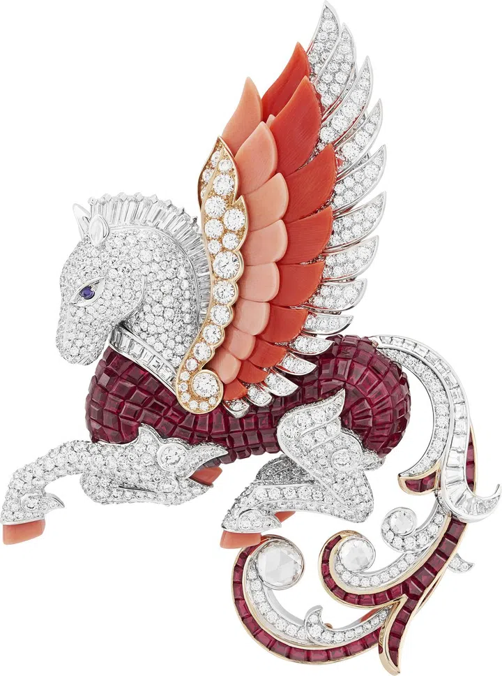 Van Cleef & Arpels梵克雅宝将 希腊神话的著名飞马化为雄伟瑰 丽的胸针,以传统隐密式镶嵌红 宝石铺镶身体,映衬双翼上的双 色珊瑚。珍罕美钻和红宝石交织 回旋,在玫瑰金上变幻成飞马的 尾巴。珊瑚的每寸细节均精心打 造。马蹄和羽毛逐一独立制作, 并以特定角度镶嵌,凸显飞马的 灵动神态。宝石切割同样一丝不 苟,圆形、长方形、玫瑰形及弧 面马眼形宝石一一展现传奇神兽 的独特风采。