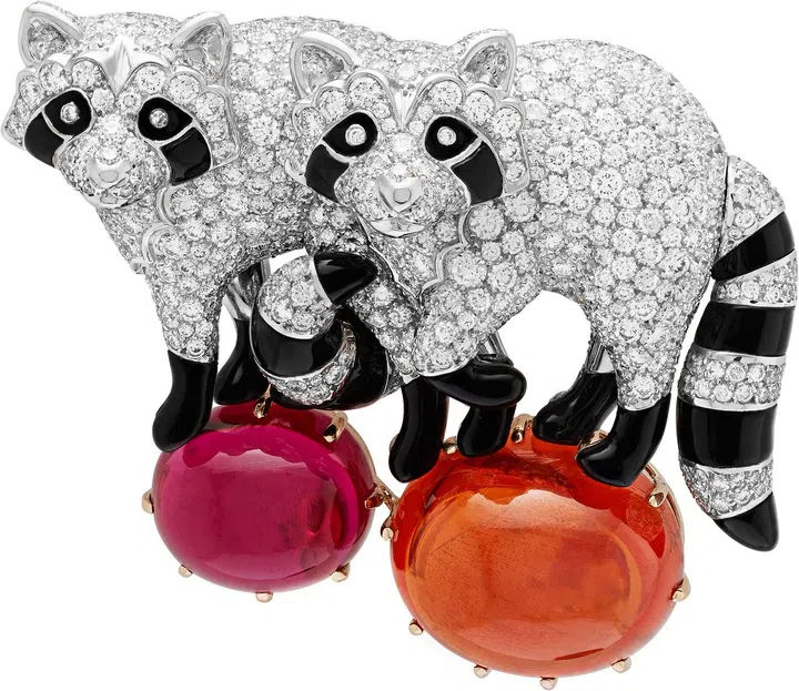 凸面形切割锰铝榴石和粉红色碧 玺光采夺目,色泽艳丽,勾划出 两只并排而立的黑白色浣熊。主 石分别重36.26克拉及12.70克 拉,为这款对比强烈的胸针贯注 愉悦活力。浣熊细节精巧,鼻 子、眼周和尾部条纹以缟玛瑙及 钻石雕砌而成;毛皮宝石铺镶紧 密,饰缀黄金幼线。胸针先以绿 色蜡制模型仿真成品效果,令浣 熊的轮廓更为挺拔立体、栩栩如 生,恍如置身梦幻的自然景色之 中,踏足前行。