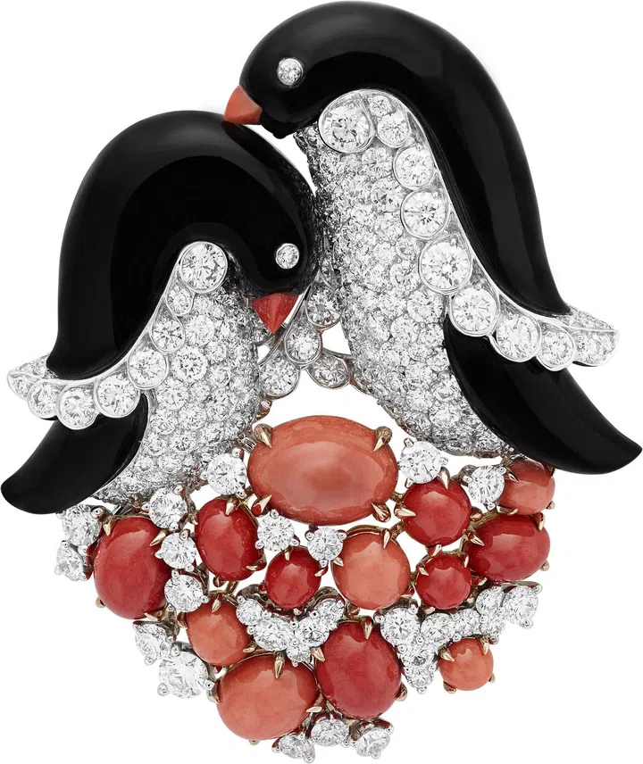 一对恩爱的企鹅牵手依偎,情景 婉约柔美。企鹅鳍边镶有钻石, 令这种南半球独有动物的因黑色 的毛皮更为突出。企鹅腹部的宝 石经镜面打磨,格外璀璨,与后 背的缟玛瑙形成对比;脚下的浮 冰则以不规则的凸面形宝石打造 而成。胸针底部与企鹅嘴喙均采 用双色珊瑚,相互呼应,尽显世 家萃选素材的高超技巧。胸针的 圆形设计隐约流露和谐气息,洋 溢浓浓爱意和同乐之谊,标志着 世家珍视的重要价值。