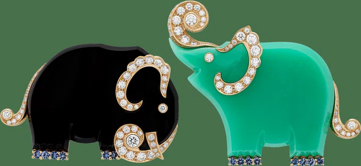 两头大象绽放青金石和孔雀石的深邃色泽,身上丰富的硬宝石映衬美 钻,神态惟妙惟肖。每颗宝石均经精挑细选、精心切割及仔细调整, 确保宝石材质映射的光芒足以令作品臻于完美。两只大象的线条均 经特意设计,轮廓仿如孩童的木制玩具,同时各具特色。雄象微微低 头,神情平和;雌象则抬起象鼻,洋溢喜乐。