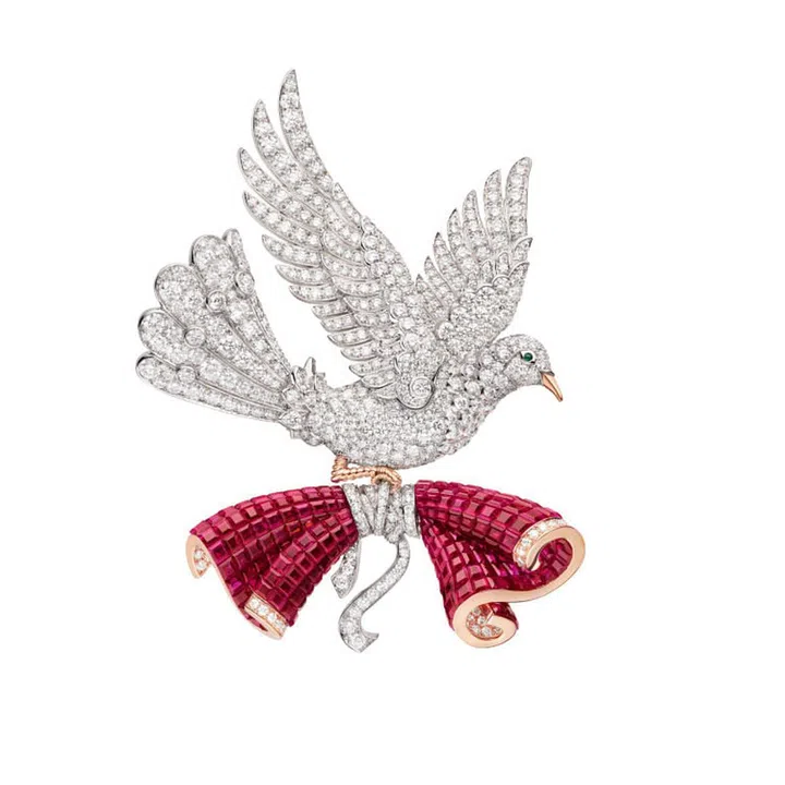 各种动物元素被巧妙地运用在了LeSecret高级珠宝中。Colombe Mysterieuse胸针上象征纯洁爱情的白鸽被描绘得栩栩如生,她优雅地展翅飞翔,鸟爪中紧握着一封以隐秘式镶嵌(Mystery Set)工艺打造的红宝石心寒,线条起伏波动。翻转信函,会发现里面一朵娇艳欲滴的玫瑰花,一条精美的玫瑰金丝带缠绕在上面。丝带上镌刻着法文“L’Amour”(爱),浪漫至极。祖母绿宝石做成的白鸽眼睛深邃迷人,网状细工雕刻工艺生动地展现了白鸽细致璀璨的羽翼。