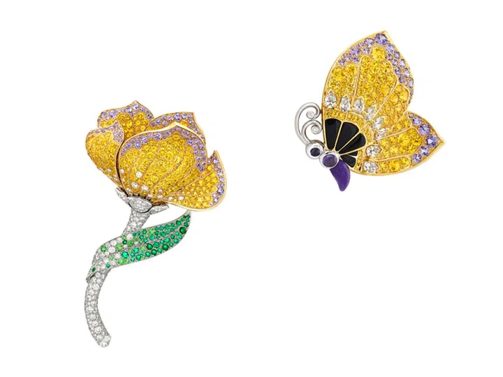 Petale de papillon花朵胸针的秘密是花冠中央栖息着的一只美丽蝴蝶,黄灿灿的色彩与周围的花瓣融为一体。轻轻拉低其中一片花瓣,即可上演翩翩蝶舞,化作一枚精致的蝴蝶胸针。Petale de papillon将两件胸针合二为一,令人惊艳。