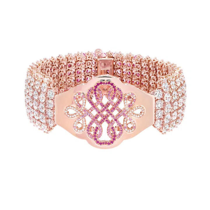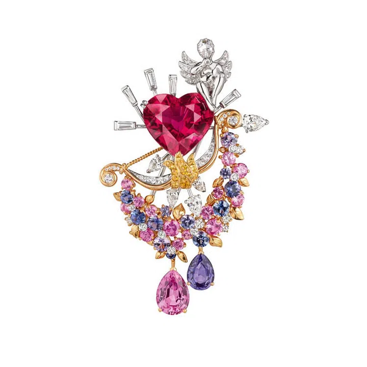 1940年代,罗马神话中的爱神丘比特首次出现在梵克雅宝的作品当中。这回,丘比特举起食指轻放唇边,神情魅惑,欲说还休。系列中的Message des hirondelles项链用黄金与钻石展现丘比特非凡的魅力。秘密藏于项链的搭扣中,拉动蝴蝶结两侧两只优雅的燕子,即可打开搭扣,分开蝴蝶结,显露出一个以红色珐琅爱心密封的玫瑰金信封,传递着希望与幸福。项链镶嵌着52颗铲子马达加斯加的淡紫色蓝宝石,共重142.1克拉,粉色、蓝色与紫色营造出渐变的缤纷色彩,多种切割方式让其更加明亮。在Secret des Amoureux胸针上,丘比特安坐于粉紫色心形红碧玺上,被一簇簇由彩色蓝宝石组成的其经典的象征玫瑰花轻轻萦绕。工匠大师将黄金细线扭成弓状,弓箭下方垂吊着粉红色及淡紫色蓝宝石束成的华丽花环。弓箭上饰以梨形及长方形切割钻石,而玫瑰形切割钻石化作了爱神丘比特的脸庞。