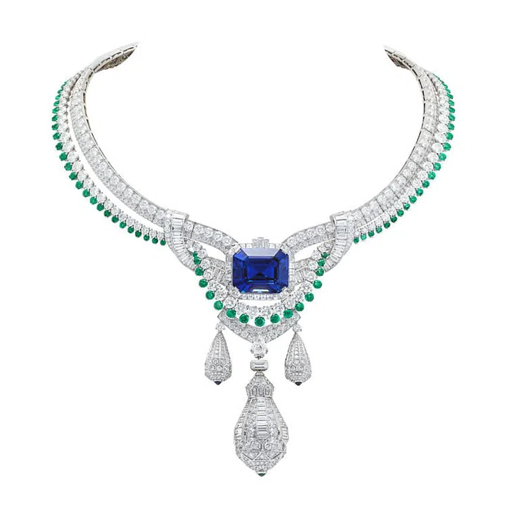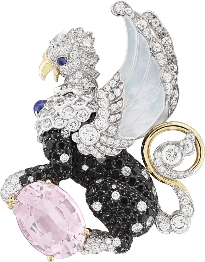 Sous son aile胸针描绘的是母亲护子的感人画面,在鹦鹉的羽翼下,可爱的雏鸟依偎在母亲的身旁。由粉红色蓝宝石、珊瑚与钻石将这样的一幕生动呈现。Pegase项链中央的水滴形吊坠中隐藏着一枚来自希腊神话中的奇幻生物飞马(Pegase)小雕像。飞马既可以隐藏起来,或是展露于人前,更可以将其拆下下来作为胸针吊饰佩戴,还能搭配另外两个可拆卸式的吊坠胸针组合佩戴。