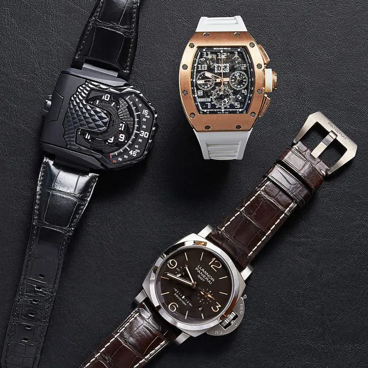 左至右:URWERK UR-T8腕表; 里查德米勒RM11-01玫瑰金腕表; 沛纳海Luminor Equation of Time腕表。