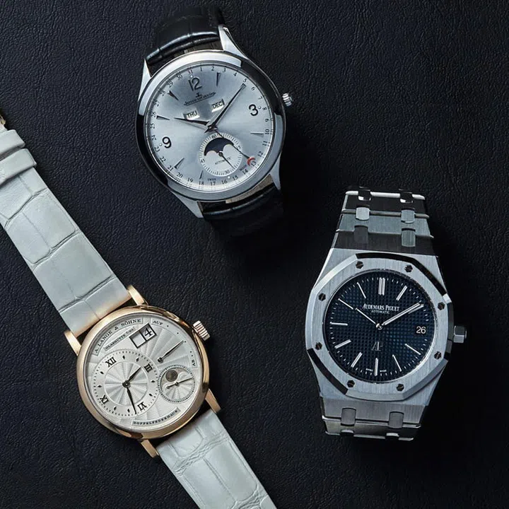 左至右: 积家Master Ultra Thin Moon白金腕表; 朗格Little Lange 1 Moon Phase腕表玫瑰金款; 爱彼Royal Oak白金腕表。