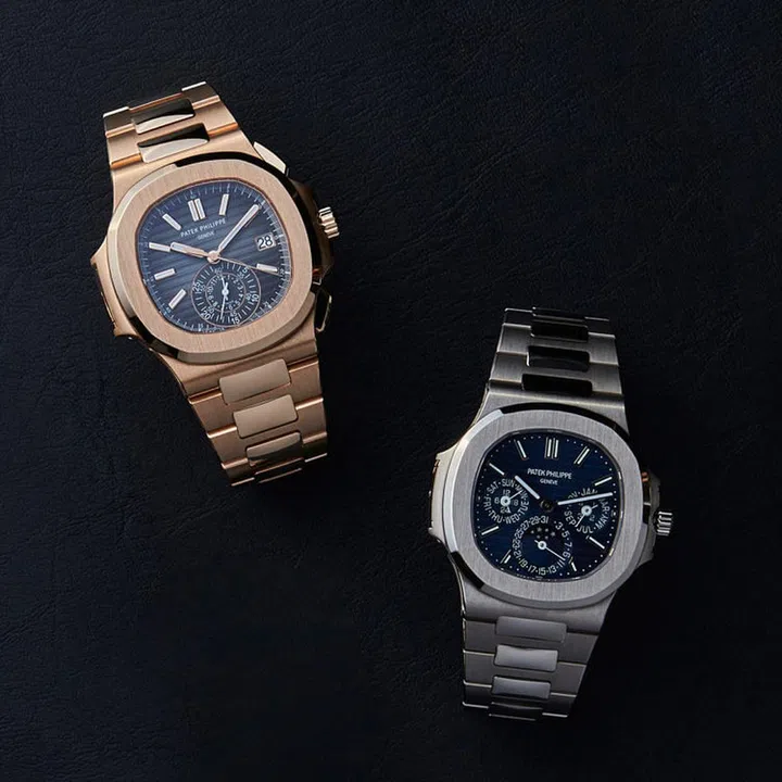 左至右: 百达翡丽Nautilus Ref. 5980/1R-001玫瑰金腕表; 百达翡丽Nautilus Ref. 5740/1G-001白金腕表。