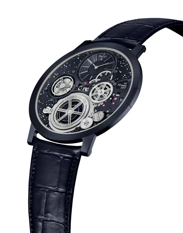 伯爵(Piaget)全新Altiplano至臻超薄系列Ultimate Concept(AUC)独一表款致献第一款AUC的首次启动走时。探索众多工艺细节,追溯令人惊叹的研发旅程。表盘正面的PIAGET伯爵品牌标志,采用了与仙子坡(La Côte-aux-Fées)表厂招牌上相同的字体。PIAGET伯爵在仙子坡诞生,时至今日品牌总部仍伫立于此。两个放大的圆环在分钟圈的圆点上标记出下午7点47分,这也是AUC首次启动走时的时间。2点30分位置的小显示窗内,镌刻着AUC的诞生日期:2017年2月7日。棘轮上还镌刻有“La Côte-aux-Fées” (仙子坡)字样以及表厂的GPS坐标。为进一步致以敬意,主机板上点缀了覆以Super-LumiNova超级夜光物料的星星,再现书写PIAGET伯爵制表历史的重要一天,仙子坡上空星光点点的浩瀚苍穹。