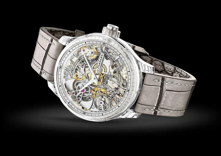 时值L.U.C系列问世25周年之际,萧邦(Chopard)推出一款超凡出众的矿物材质时计,在短短五年时间里第二次颠覆三问报时设计理念。除了所搭载的瑞士官方天文台(COSC)认证L.U.C 08.01-L型机芯配备蓝宝石水晶玻璃音簧,全新L.U.C Full Strike Sapphire腕表的表壳、表冠和表盘完全以蓝宝石水晶玻璃整体加工而成。这款42.5毫米直径腕表通体晶莹透明,可供360度全方位鉴赏润饰精美的机芯。腕表三问报时音质丰富出色,两位声学奇才——雷诺和戈蒂耶·卡普松(Renaud and Gautier Capuçon)兄弟亦对其赞不绝口。