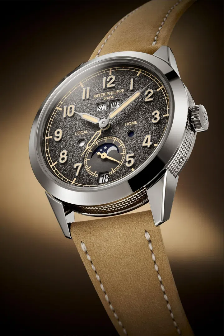 百达翡丽(Patek Philippe)Ref. 5326G-001年历旅行时间腕表搭载获八项专利的新款31-260 PS QA LU FUS 24H自动上弦机芯,具备与当地时间同步的日期显示功能,因此在更改时区时,日期也会自动随之调整。此款腕表配备搭配全新Calatrava表壳,造型独具一格。侧边雕饰别出心裁的巴黎钉纹图案,表盘外缘装饰汲取古董照相机的复古格调。