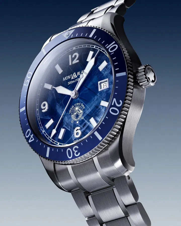 万宝龙(Montblanc)全新推出的1858系列潜水腕表搭配独特的“冰川纹”表盘,由品牌制表师采用的特殊制作工艺“grattéboisé”来制作表盘,以呈现出更为逼真的冰川深邃感。41毫米的精钢表壳,搭配双色陶瓷单向旋转表圈,表背特别镌刻立体图案,巍然立于海面的冰山以及于水下勇敢探索的潜水者栩栩如生。腕表配备三种不同颜色的表盘可供选择——冰川蓝、远山绿和玄岩黑,灵感源于不同色调的冰川冰。