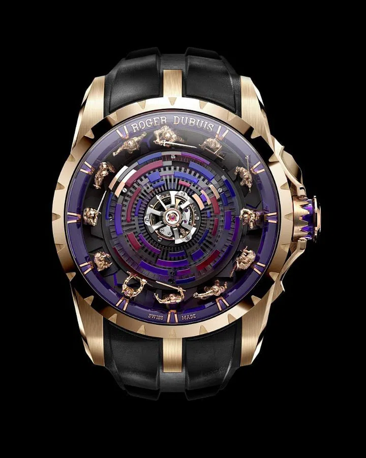 罗杰杜彼(Roger Dubuis)圆桌骑士又有全新作品亮相,Roger Dubuis Knights of the Round Table Monotourbillon/X是系列的第8款作品,恰好这「8」这数字品牌已故创始人Roger Dubuis 的幸运数字,所以让这腕表又多了一重意义。此表款的正面具有十分独特而醒目的设计:12个微型骑士雕像围绕着圆桌表盘而排列。这些以手工制作的骑士代表着参与寻找圣杯任务的12位人物。圆桌以蓝宝石水晶玻璃和慕拉诺玻璃块体制成,象征着骑士们的团结与平等。此腕表搭载着罗杰杜彼自制的自动上链机芯且获得日内瓦印记认证,此乃高级钟表界最严谨的品质认证之一。