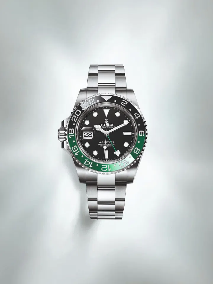 劳力士(Rolex)格林尼治型II腕表能够于洲际旅行时,同时显示两个不同时区,其坚固性能和多用途外观亦备受推崇。过去这款腕表以红蓝色陶瓷表圈分隔白天与黑夜,因与百事可乐配色相似而被昵称“可乐圈”。今年新推出的款式采用了黑色表盘和绿黑双色陶瓷圈,更特别的是,这款腕表调整了表冠位置至9点位,使其可以方便佩戴于右手腕上,是极少见的“左撇子腕表”。