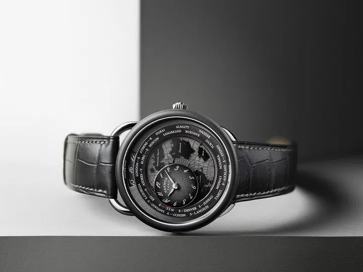 爱马仕(Hermes)致力于探索时间的哲学,焕新诠释高级腕表的经典复杂功能。Arceau Le Temps Voyageur漫游时光腕表以别出心裁的手法,另类解读世界时间,彰显神秘魅力。此款腕表采用爱马仕独家研发的“漫游时光”(Travelling Time)装置,通过一个圆盘显示全球24个时区。活动计时盘跃然表盘之上,如卫星般环绕着虚拟地图旋转,地图灵感源自Jérôme Colliard设计的《世界马术地图》(Planisphère d’un monde équestre)丝巾图案。