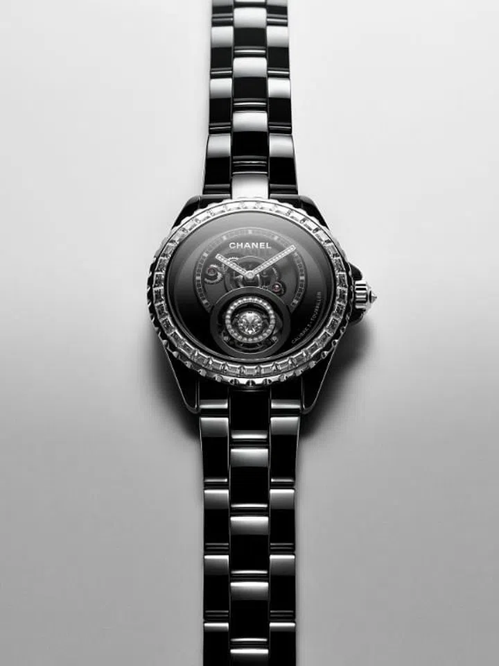 搭载品牌全新自制Caliber 5手上链机芯的香奈儿(Chanel)J12钻石陀飞轮腕表陀,推出黑色亮面高抗磨陶瓷搭配白金表款以及黑色雾面高抗磨陶瓷搭配不锈钢表壳等两种版本,前者的表圈镶上闪耀的长阶梯形钻石,而后者表圈则镶入长阶梯形切割黑色雾面高抗磨陶瓷。腕表外观採用偏心式面盘格局,时、分指针偏置于面盘上半部,陀飞轮装置则与时、分表盘部分重叠盘踞6点位置。陀飞轮框架中心镶嵌1颗有65个切面的钻石。