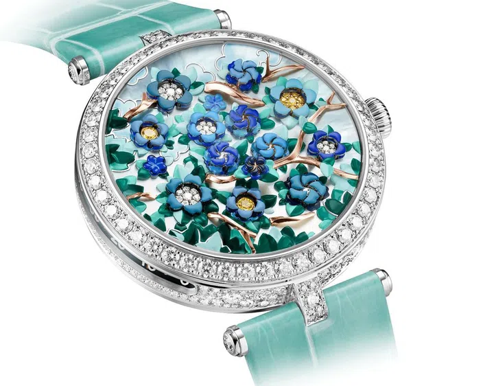 梵克雅宝(Van Cleef & Arpels)Lady Arpels Heures Florales Cerisier腕表从“林奈的花钟”(Linnaeus’ Flower Clock)中汲取灵感,为世家钟爱的主题——迷人的大自然带来崭新面貌,将时间指示方式以诗意手法呈现。每整点表盘上的花朵精准开绽,开放的花朵数指示着“小时”,表壳侧边的视窗则指示着“分钟”。