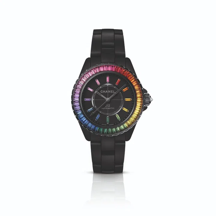 电子音乐跨越了音乐的领域,发展成为一种真正的审美文化。它超越声音本身,成为一种包罗万象、感官的、具象的体验。香奈儿Chanel Electro限定系列腕表的核心风格在于黑白与彩色的对比,色彩将白色点亮,黑色的深邃则将色彩映衬得更为热烈。J12 Electro Dream腕表在表圈上镶嵌12种颜色的蓝宝石,融合成一个色彩渐变的完美圆形,绚丽闪耀。表盘上12颗长阶梯型切割时标与表圈的色彩排列相互辉映。备有黑色和白色精密陶瓷两种款式供选择。