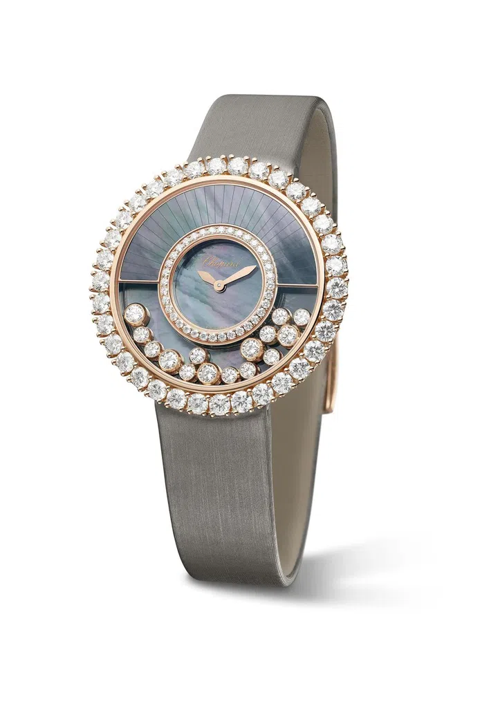 Happy Diamonds系列自1976年问世以来便成为“乐享生活”的代名词。系列新作以萧邦(Chopard)经典作品为灵感,腕表的中心以符合伦理道德标准的18K玫瑰金打造而成,密镶钻石和虹彩大溪地灰色珍珠贝母,圆形内表盘采用圆润的金色叶形指针,外层表盘饰有十五颗灵动钻石。这款Happy Diamonds珠宝腕表的独创性在于外表盘上半部的中空隔层,自由旋舞的钻石可以暂时隐匿其中。当灵动钻石离开这条“秘道”时,则仿佛瀑布般倾泻至表盘底端。两种大小不同的钻石相互追逐躲闪,嬉戏其间,宛若在腕表之上打造的“钻石瀑布”,炫丽璀璨。搭配色磨砂帆布表带及镶钻18K玫瑰金表扣。