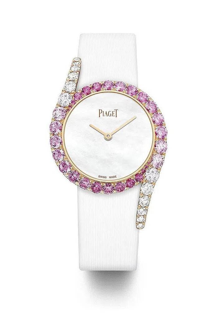 三款缤纷悦目的伯爵(Piaget)Limelight Gala系列Precious限量版时计新作分别以蓝色、黄色及粉色闪耀呈现。这三种颜色亦映射了一天中随太阳运行轨迹而变化的景象蓝色代表了清晨的天空,黄色象征着正午的灿阳,粉色则展现了落日的余晖。每款腕表均镶嵌以彩色蓝宝石和钻石,自表圈环绕并延伸至双侧表耳,其色调也从浓郁的深色逐渐晕染变淡,展现出流动般的色彩。寻找色度和尺寸精准的蓝宝石本身就是一门艺术,伯爵的宝石学家需从无数珍贵宝石中层层筛选,才能通过宝石间精妙的色彩递进,呈现颜色自然衔接的渐变效果。每枚腕表均搭载伯爵自主研发生产的自动上链机芯。