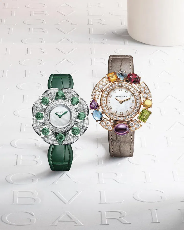 宝格丽(Bvlgari)全新Divissima腕表是经典Divas’ Dream腕表的精巧演绎,更易于佩戴,备有两种款式,表盘四周环饰该系列标志性的扇形图案,更添一抹轻盈灵动与珍贵华彩。全新Allegra腕表则捕捉“甜蜜生活”的欢愉精神,淋漓尽致地展现了宝格丽珠宝腕表的瞩目魅力。各式切割与多样造型的宝石交织闪烁,环饰于表盘四周,搭配精湛的金质镶嵌工艺,演绎华光流转的璀璨盛景。