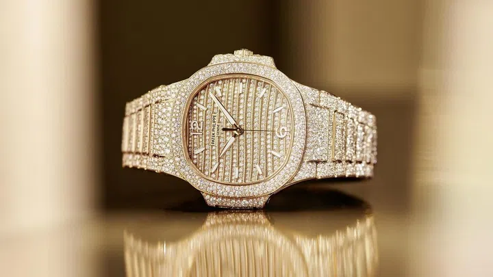 百达翡丽(Patek Philippe)在钟表与奇迹展开幕之际呈献Nautilus系列四款优雅新作,其中这款Ref. 7118/1450R-001镶嵌2,553颗明亮式切割顶级威塞尔顿无瑕美钻(约12.69克拉),采用罕见的“雪花镶嵌”工艺,令腕表更添熠熠光彩。这项工艺需要将大小各异的钻石镶嵌并固定到位,尽可能隐匿每颗钻石之间的贵金属痕迹。百达翡丽一直以来都追求表盘清晰易读,高级珠宝腕表也不例外。因此,这款新品的表盘采用覆荧光涂层的玫瑰金A形时针和分针,搭配同样覆荧光涂层的玫瑰金立体阿拉伯字块。玫瑰金表壳内搭载324 S自动上弦机芯。18K玫瑰金表链采用百达翡丽专利折叠式表扣,以四枚独立锁扣固定,风格优雅,佩戴舒适。