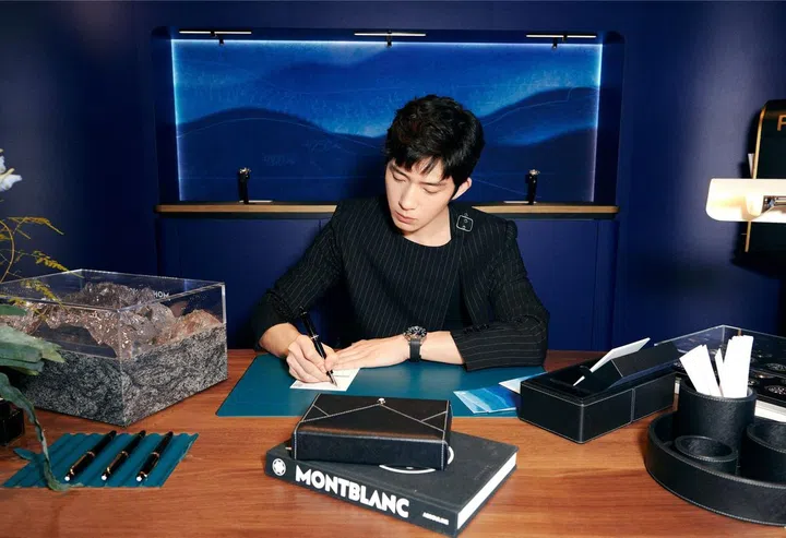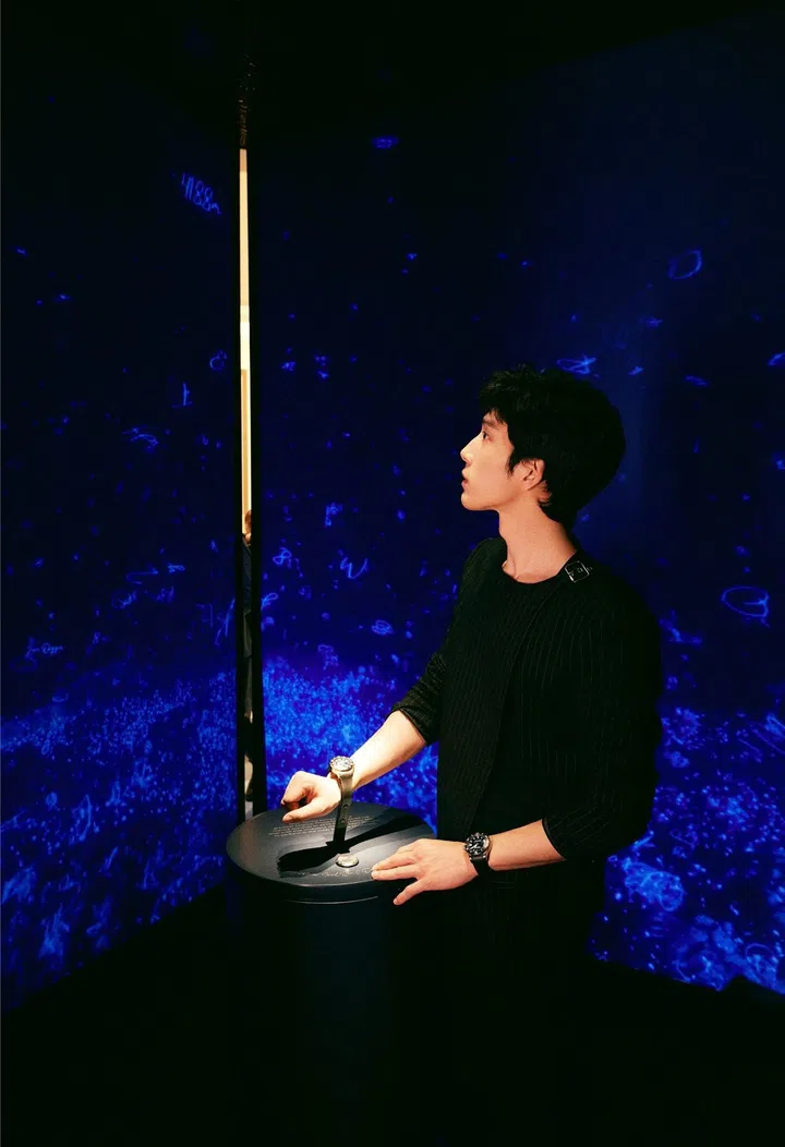 万宝龙(Montblanc)全球品牌大使井柏然以一身黑色条纹歇肩套装佩戴全新万宝龙冰川系列潜水无氧腕表4810米深潜特别款腕表参观表展。万宝龙展厅被精心打造成一片幽蓝神秘的冰川深海,井柏然流连驻足展厅中央的庞大艺术装置冰立方之内,腕上腕表一同沐浴于穿透而下的光线之中,宛若沉浸在幽谧冰冷的深海,屏息间探寻自我极限。