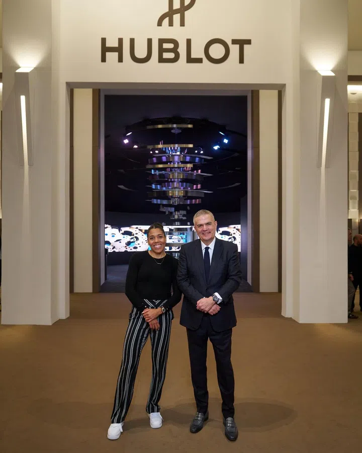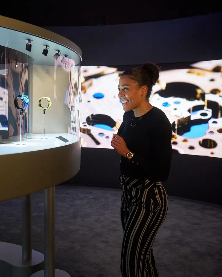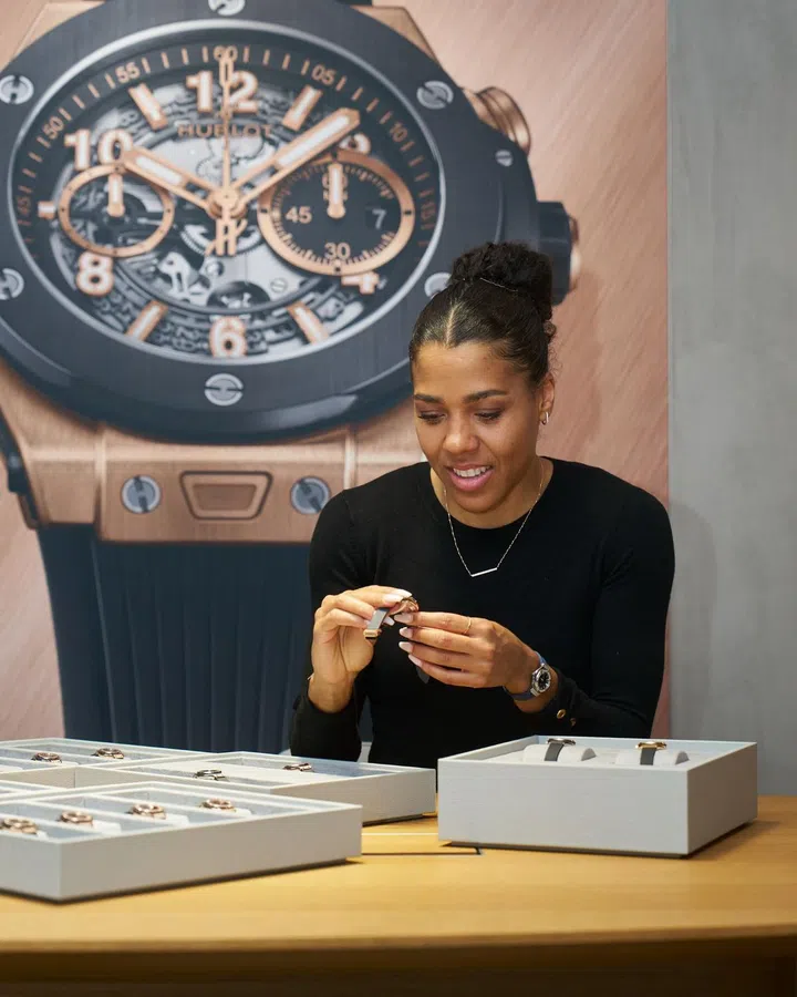 女子短跑运动员穆金加•坎邦德吉(Mujinga Kambundji)以品牌大使身份参观“钟表与奇迹”高级钟表展宇舶表展台。