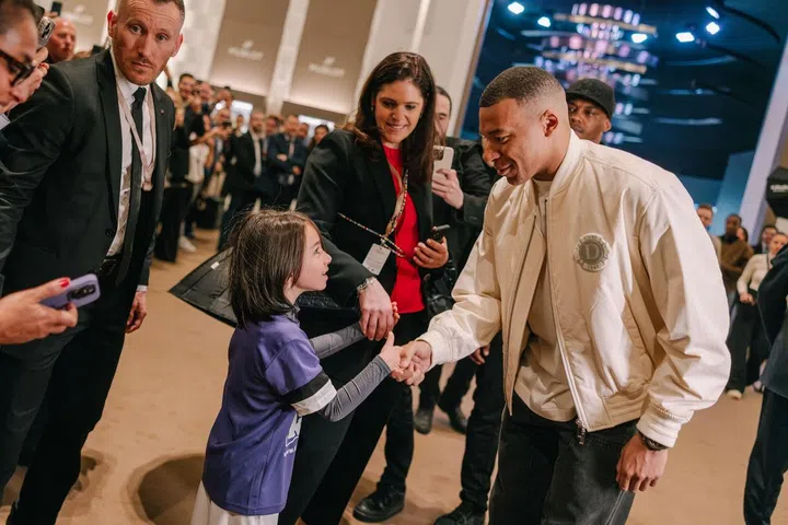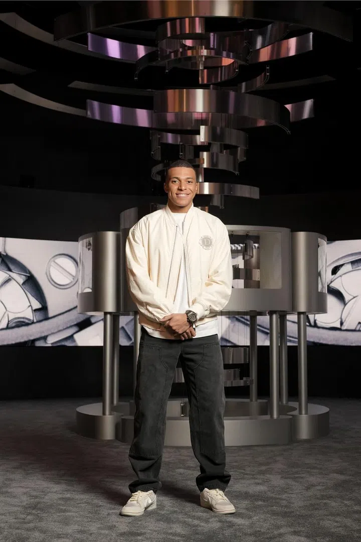 宇舶表(Hublot)品牌大使基利安•姆巴佩(Kylian Mbappe)佩戴 BIG BANG UNICO 全魔力金腕表到访2024日内瓦“钟表与奇迹”高级钟表展宇舶表展台,在宇舶表首席执行官里卡多•瓜达鲁普(Ricardo Guadalupe)的陪同下欣赏字舶表2024日内瓦“钟表与奇迹”新款时计。