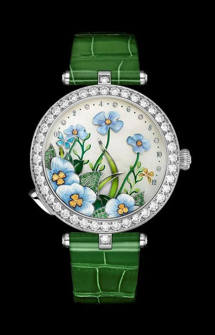 梵克雅宝(Van Cleef & Arpels)以其精致的珠宝和高级腕表享誉世界。梵克雅宝的Lady Arpels Brise d’Ete腕表,以白K金和黄K金镶嵌彩绘玻璃珐琅打造,表盘上层次丰富的微型彩绘呈现春天花园的景象。