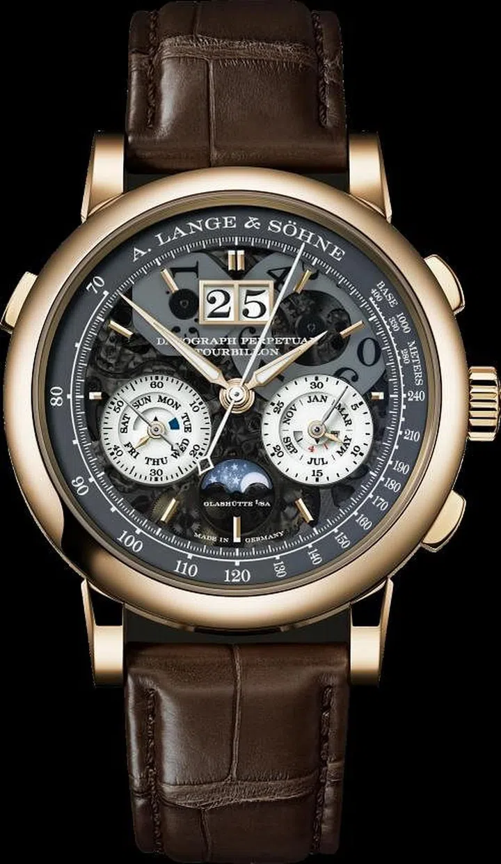 朗格(A. Lange & Sohne)以其精准的机械表和复杂功能闻名。朗格的Datograph Perpetual Tourbillon Honeygold Lumen腕表,以Honeygold表壳和Lumen层展现复杂功能的混合体,包括陀飞轮、飞返计时码表、月相和万年历。其L952.4机芯由684个组件组成。限量发行50只。