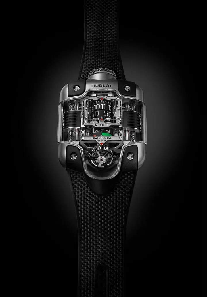 宇舶表(Hublot)的新Hublot MP-10 Tourbillon Weight Energy System重新审视了钟表制造的基本原理:没有表盘、指针或摆轮,取而代之的是一个滚筒显示屏、一个圆形动力储备和由两个线性重物倾斜驱动的陀飞轮自动上链系统,绝对让人惊艳。限量发行50只。
